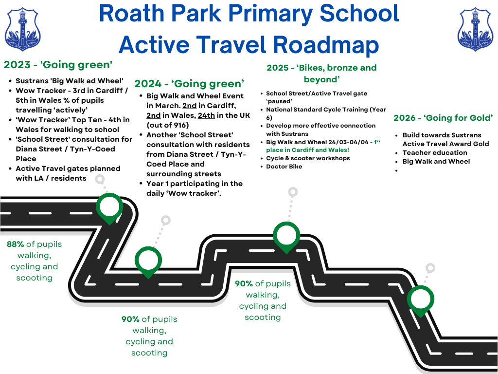 We have been working hard to promote safe and sustainable journeys to and from school. This has resulted in nearly a third of our children taking up active travel in the past four years. We are frequently recognised as one of the top schools for Active Travel in Wales and across the United Kingdom.
